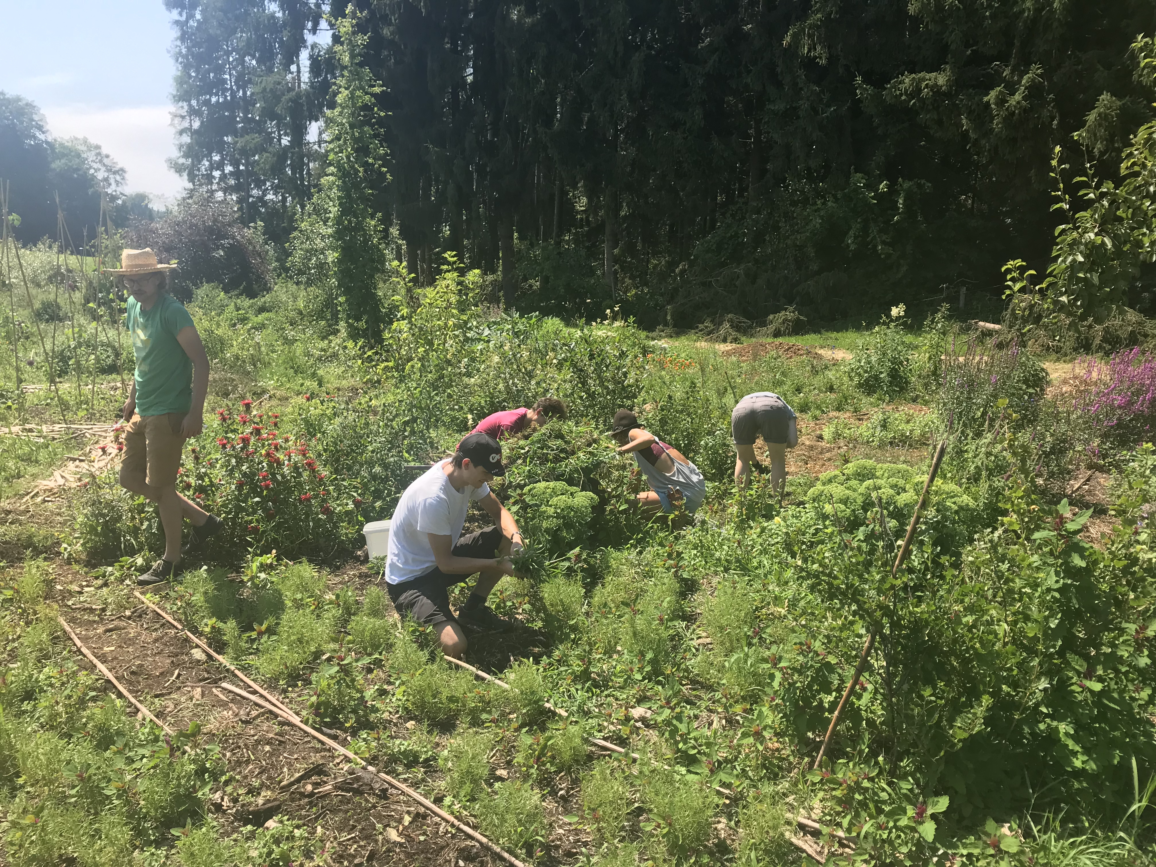 Gemeinsam fahren wir mit dem Velo zu einem Hof in der Umgebung, wo wir etwas über nachhaltige Landwirtschaft erfahren und gleich selber ein paar Stunden auf dem Feld anpacken.